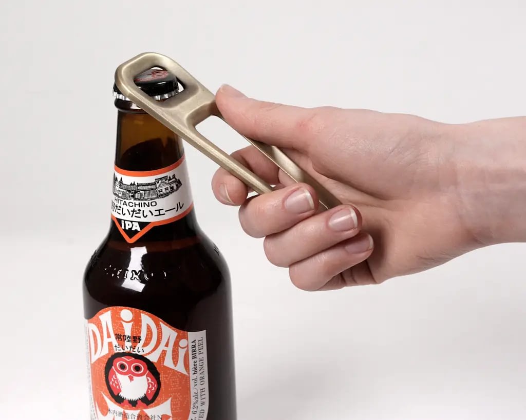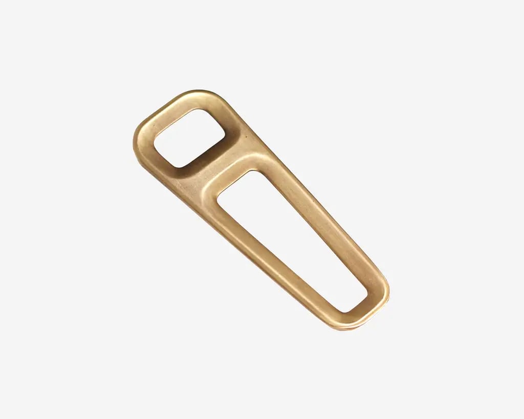 Muotoilin tämän avaajan korealaiselle asiakkaalle. Painemuovattu messinki antaa tuotteelle miellyttävän painon. Pyöreiden muotojen ansiosta sitä on mukava pidellä, eikä se tee vahinkoa iholle, pöydälle tai taskuun. Muodon leikkaukset ja viisteet vähentävät avaajan painoa, samalla ne antavat sille myös sopivan terävän, pullonkorkkiin hyvin tarttuvan reunan. Muoto tukee rentoa mutta tukevaa otetta. Tuloksena on juuri tälle pullonavaajalle ominainen tuntuma ja ulkoasu.
