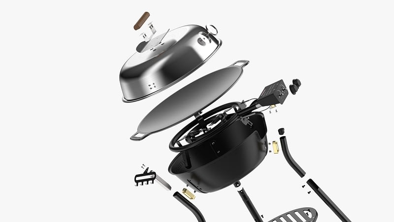 Enhanced efficiency by optimizing the burner bowl for even airflow and heat distribution. Modular flexibility with interchangeable accessories, like shelves and lids, allow users to tailor the setup to their needs. Recognizable details throughout the design, such as the subtle “D” shape in knobs, handles, and legs, create a sturdy and timeless aesthetic.